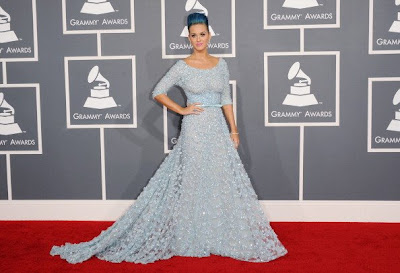 New Looks of katty perry. by coloring her hair with blue,, she seems freshly and get difference from others. her gown also glamomur and seems very – very expensive from famous designers.